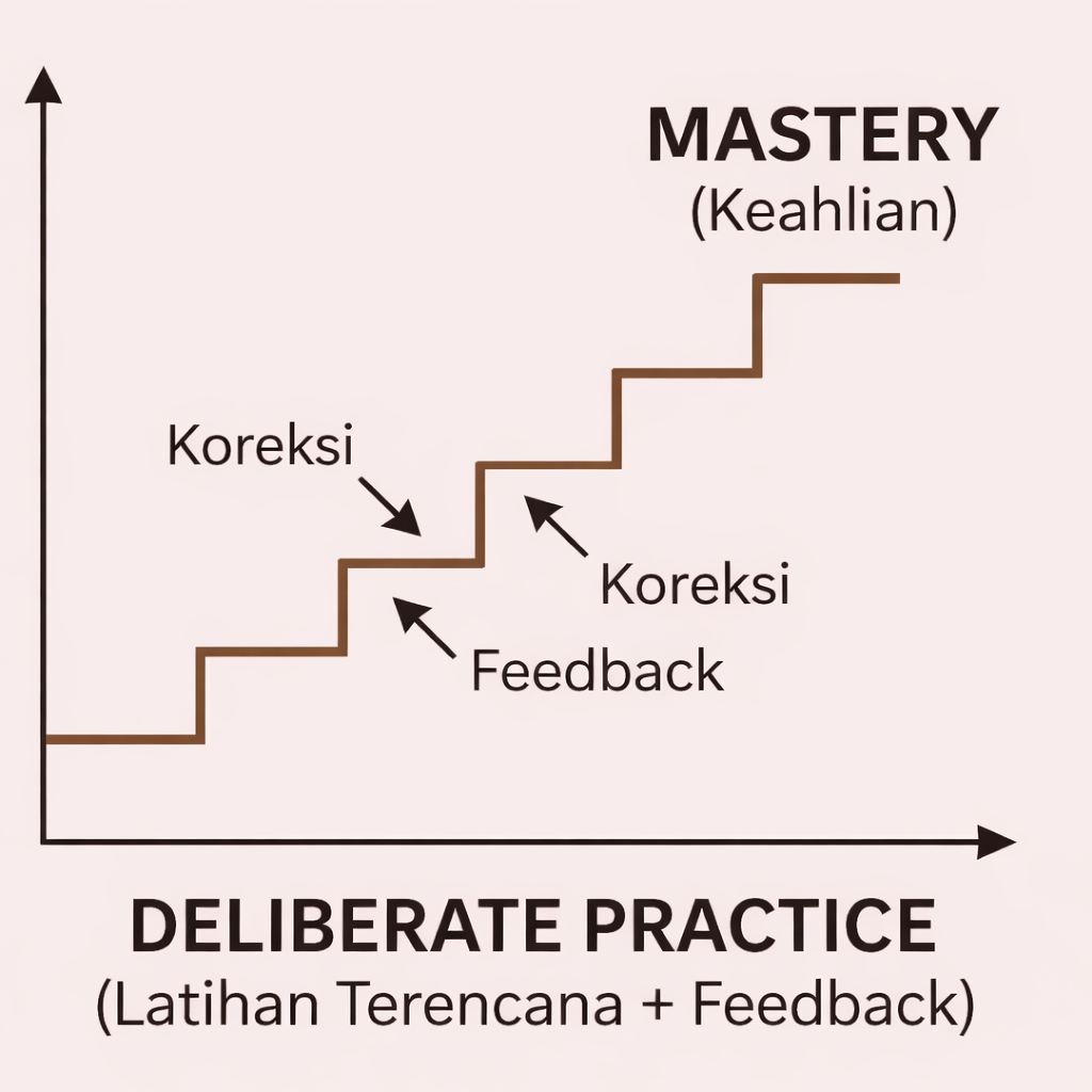 Dalam risetnya, Ericsson menemukan bahwa perbedaan antara profesional biasa dan ahli kelas dunia bukan terletak pada lamanya waktu bekerja, melainkan pada kualitas latihannya. Ia menyebut pendekatan ini sebagai deliberate practice — latihan yang terstruktur, penuh kesadaran, dan dirancang untuk mendorong batas kemampuan.